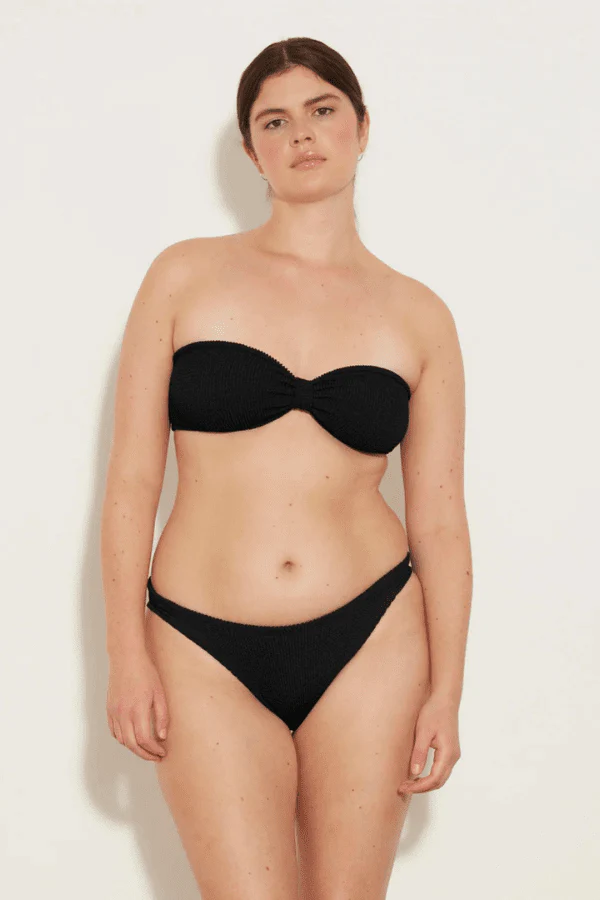 One of our most popular styles, the Hunza GÂ Jean is truly for everyone. Moderate adjustable coverage on both top and bottom provides wearability for most. Bow-style bandeau top and classic bottoms, both in our signature crinkle. Perfect for mixing with other crinkle bikinis, or worn alone in all its glory.