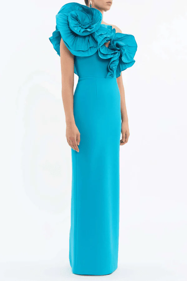 Introducing the Rebecca Vallance Ella Gown in Blue. The Ella Gown is a striking dress, combining elegance with a contemporary twist. Crafted from bonded crepe, the gown features a stunning one-shoulder applique taffeta neckline. It is secured with a side zip fastening, and the fitted bodice with contrasting taffeta and column skirt is cinched at the waist. Adding a touch of sophistication and elegance, a back split completes the design.